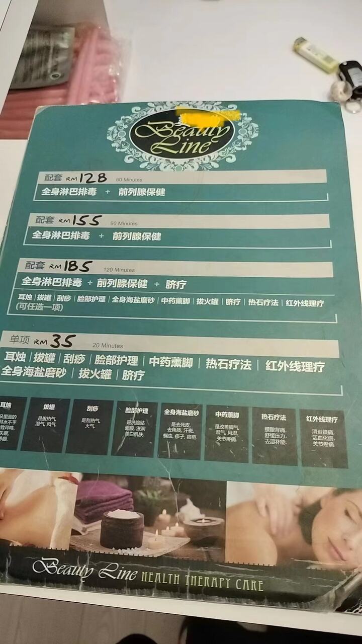 价格服务:1小时全身淋巴排毒+前列腺保健RM128,1.5小时全身淋巴排毒+前列腺保健RM155,2小时全身淋巴排毒+前列腺保健+脐疗RM185